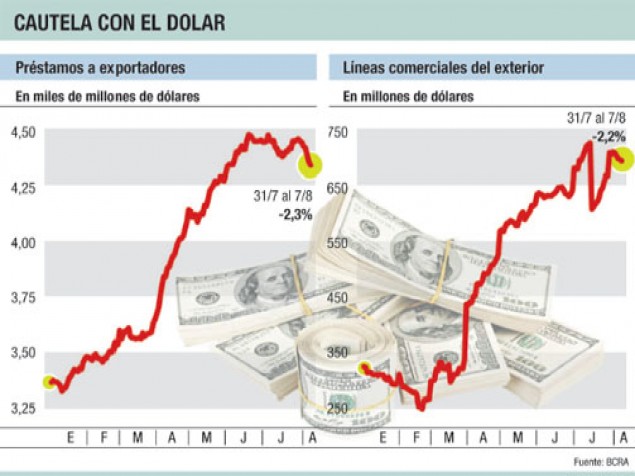 En los últimos meses, los exportadores habían optado por endeudarse principalmente en pesos, para evitar asumir compromisos financieros en dólares que pudieran encarecerse en el futuro ante un eventual ajuste cambiario. La decisión de este grupo de compañías empezó a perjudicar, entonces, al Central, porque los préstamos en dólares -que tomaban tanto de bancos corresponsales del exterior como de entidades financieras locales- generaban un ingreso de divisas al país que fortalecía las reservas del organismo. La nueva reticencia a endeudarse en moneda extranjera hizo que estos créditos en dólares dejaran de crecer a partir de junio y reflejaran, a partir de ahí, un descenso en el stock (Ver infografía).