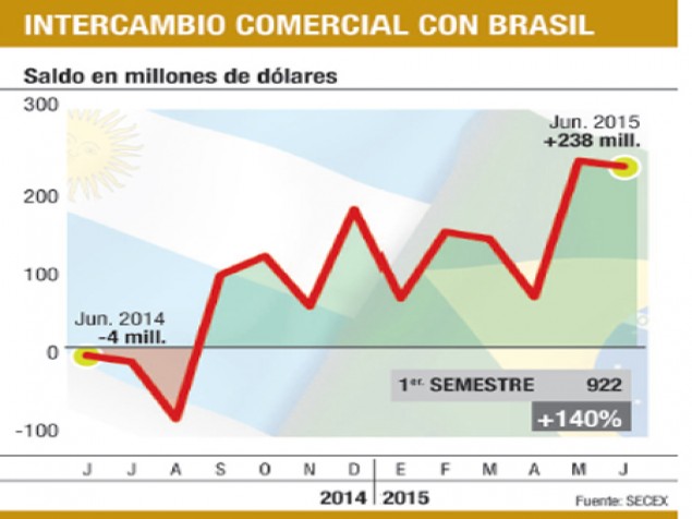 El balance del primer semestre presenta un fuerte aumento del déficit con Brasil al pasar de un rojo de u$s 384 millones en 2014 a u$s 923 millones este año, lo cual implica un incremento del 140%. Las exportaciones argentinas cayeron un 21% (u$s 5.555 millones) mientras que las brasileñas disminuyeron un 13% (u$s 6.478 millones). Cabe señalar que las importaciones totales de Brasil acusaron el impacto de la recesión al registrar en junio una caída interanual del 20%, por lo que no sólo sufrieron las argentinas. El ajuste fue generalizado. Así Brasil pudo mostrar una mejora de la balanza comercial, la más importante en los últimos tres años. Si bien el nivel del rojo de junio con Brasil es menor al de los meses anteriores, nada parece indicar que el panorama se modifique, ya que la caída del PBI de Brasil (estimada en un 2% este año) continuará y el tipo de cambio seguirá depreciándose, lo que frena la demanda de importaciones (sobre todo del complejo automotor, que concentra el 55% del comercio bilateral) y favorece las exportaciones.