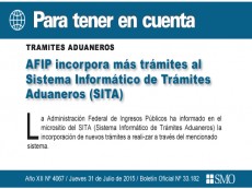31/07/2015 | La Administración Federal de Ingresos Públicos ha informado en el micrositio del SITA (Sistema Informático de Trámites Aduaneros) la incorporación de nuevos trámites a realizar a través del men...